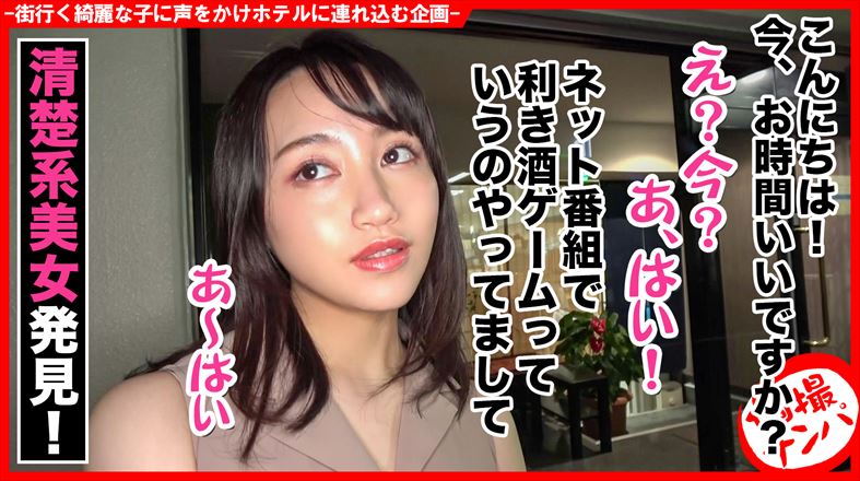 今夜も繁華街でお暇そうな美女を探して徘徊でございます。仕事帰りでブラついている清楚そう(おっぱい大きそう)なターゲットを発見っ!さっそくお声がけしてみたらお時間は大丈夫そうなので企画決定です☆そうです!!今夜はみんな大好き利き酒選手権!!日本酒はあまり飲んだことないという事でちょっと苦戦しちゃうかな?飲みながら色々お話聞かせて頂きました。酔っ払うと明るくなっちゃってお持ち帰り経験も有りって言われたらこちらも後には引けません(笑)ふわふわおっぱいはFカップ!なし崩しに脱がせても全然抵抗しないじゃん(笑)「どうすればいい?」って…ガッツリSEXさせて下さい!エッチな唇でネットリキスしたらオマ◯コも熱々になって指もスルッと入っちゃった☆零れそうなお汁を全部舐めて気持ちよくなってもらったらチン◯ンも気持ちよくしてもらいましょう。ねっとりしたノーハンドフェラでこんな上手に舐められたの初めてでメチャクチャ気持ちいい…。気持ち良すぎて限界寸前なのでバックに押し倒して即ズボピストン!ビッチョビチョオマ◯コのヒダが絡みついてくるし、自分で腰振っちゃって真面目そうな見た目なのにマジエロい!気持ち良すぎてピストンが止まらないっ!挿れたばっかりなのに中出しでイッちゃいました(笑)まだ満足出来ないよね?オモチャで遊んでみようか?バイブで子宮までガンガン捩じ込んであげたら痙攣しながら何回もイッちゃって変態になっちゃたね☆イキまくってトロトロになったオマ◯コにまた挿れたくなっちゃった。Fカップの巨乳をハードピストンでブルンブルン揺らせて堪能して胸ブッカケしちゃいました。