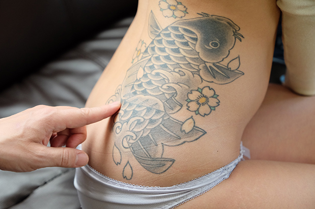 刺青と言うとヤクザのもんもんな感じですが、もう少しファッショナブルな感じのタトゥーですね。可愛らしい顔にタトゥーをまとった肉体の艶めかしい美しさ、その肉体が快感に酔いしれ蠢く様が素敵。火照って紅潮した肌が、タトゥーの美しさを際立たせる。意外と無邪気で可愛らしいルックスとキャラとのギャップも素敵です。