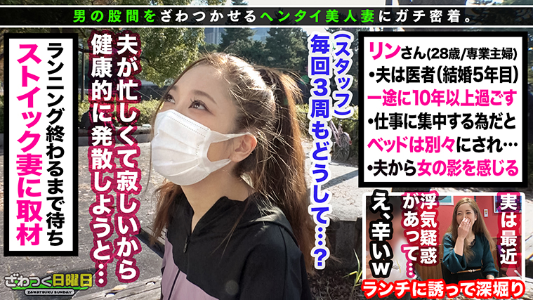 “刺激が欲しい”“ちょいムラ”“なんだかアソコがざわつく”そんな普通の主婦さん達の仮面に隠された性欲を剥き出しにしてあの手この手でヤリまくる何でもあり企画!!#01.さな/30歳/専業主婦(社長夫人)※神々しいまでの美しさ!完璧美肌スレンダー妻とトロけ合う濃密ハメ撮り!中出し2連発!#02.りん/28歳/専業主婦〈ネトリ×ネトラレ!復讐に駆られたベテラン主婦の浮気セックス!〉皇居ランで美ボディを維持する神スレンダー妻!#03.みのり/30歳/フリーモデル(既婚)〈ガチ肉食系G乳モデル妻!ヤリモク撮影会で激潮ヌレヌレSEX!!〉マチアプで知り合ったフェロモン全開ヤリマン妻!#04.しずな/28歳/専業主婦(家出中)〈夫婦喧嘩はNTR注意!家出妻が日帰り種付けSEX2連発!〉旦那と大喧嘩をして放浪中の美顔妻を発見!デカチンの虜になって完全にメスと化すドスケベ妻の姿を4時間収録!!動画配信サイト『MGS動画』の独占人気シリーズ【ざわつく日曜日】…DVD第5弾!!