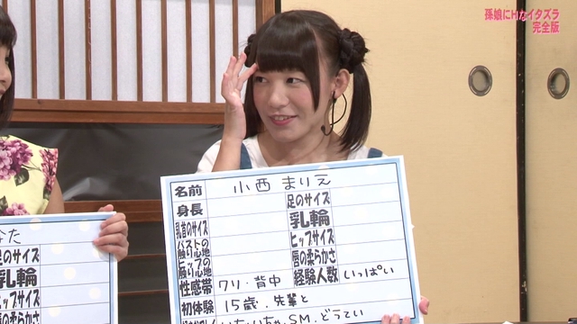 ★孫娘になりきって、おじいちゃん役の視聴者の皆さんと、Hなことをしちゃう女の子はこの3名!パイパンの小西まりえちゃん、ロ◯巨乳の今井まいちゃん、おませな瀬乃ひなたちゃん★身体測定では、身長や乳輪の大きさを図ったり、テレフォンSEXでおじいちゃんとバーチャルHしたり、おじいちゃんからのムチャ振りでバーチャル大乱交になったりと、超難易度の高いバーチャルプレイ?をお楽しみ頂けます。