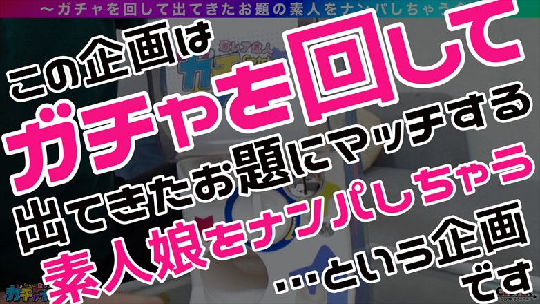 ガチナンパはもう古い!令和のナンパは『ガチャ』でしょ!ガチャを回して出てきたお題にマッチする素人娘を街角でGotcha!(捕まえる)お題は『メガネ女子』『人妻』『身長170cm以上』『Hカップ以上』など、毎回何が飛び出すかわからない!狙うはもちろん SSR(スーパー・スペシャル・レア)のドスケベ素人だ☆今回Gotchaした美女は…、リピ率100%!本指名のとれない人気No.1ソープ嬢・なつきちゃん(??歳)。妖艶な雰囲気を漂わせる超絶美女は脱いでもスゴイ!!KKR(神乳・神尻・レア)!今回のガチャイベントはバッティングセンター!!不慣れなバッティングに悪戦苦闘しながらも楽しい時間を過ごした後は、汗ばんだ身体をキレイに○い流したい所・・・ということで、ホテルに移動してNo.1ソープ嬢の実力を堪能することに!!こちらで用意した下着は上も下もスケスケでほとんど裸!おわん型のキレイなお胸とハリ艶あるお尻を目の前にして生唾を呑んでしまった。その後は丁寧にチ〇コを○ってもらい、ローションをつかってのマットプレイ!!全てにおいて特級レベルのテクニックにリピ率100%は頷ける。さらに、極上のサービスは続く!!おもむろに跨った彼女はそのままヌルっと生挿入!!彼女は腰をくねくねと動かしイキまくる!こちらも負けじと止めどなく腰を振り続いて、そのまま中出しフィニッシュ!ベットに移動してからも熱が冷めないプレイが続く・・・至極の2発射!!#激レア素人ガチャナンパ!B:88 W:53 H:88※この作品は成人にコスプレをさせています。※この作品の出演者は全て19歳以上の成人です。(All performers in this work are adults over the age of 19.)